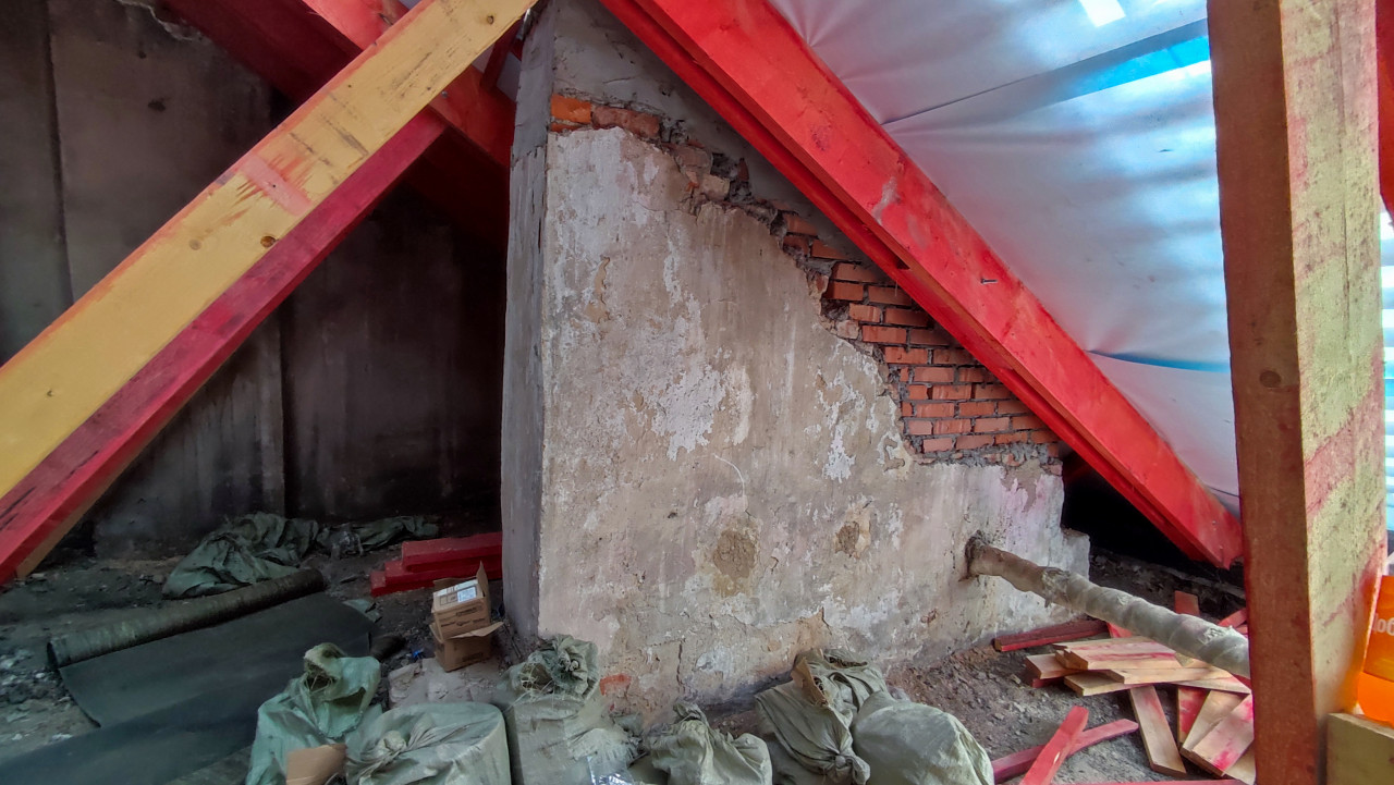 На фото показан чердак здания в процессе ремонта. В центре кадра выделяется кирпичная стена с частично разрушенной штукатуркой и открытой кладкой. Сверху проходят новые деревянные стропила, окрашенные в красный цвет, а рядом установлена дополнительная опорная балка. На полу заметны строительные материалы, обломки и остатки старых конструкций. Снимок можно использовать в материалах о ремонте, реконструкции и инженерных работах в жилых зданиях.