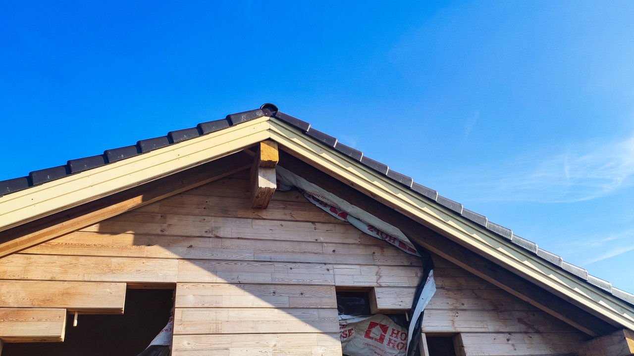 На фотографии представлен крупный план фронтона дома, выполненного из деревянного бруса. Видна крыша с черепицей темного оттенка, а также элементы утепления и пленки, использованные в процессе строительства. Часть проемов в стене остается незакрытой, что указывает на незавершенный этап работ. На фоне — ясное голубое небо. Снимок отражает процесс строительства частного дома и может быть использован в иллюстрациях к материалам о кровельных и фасадных технологиях.