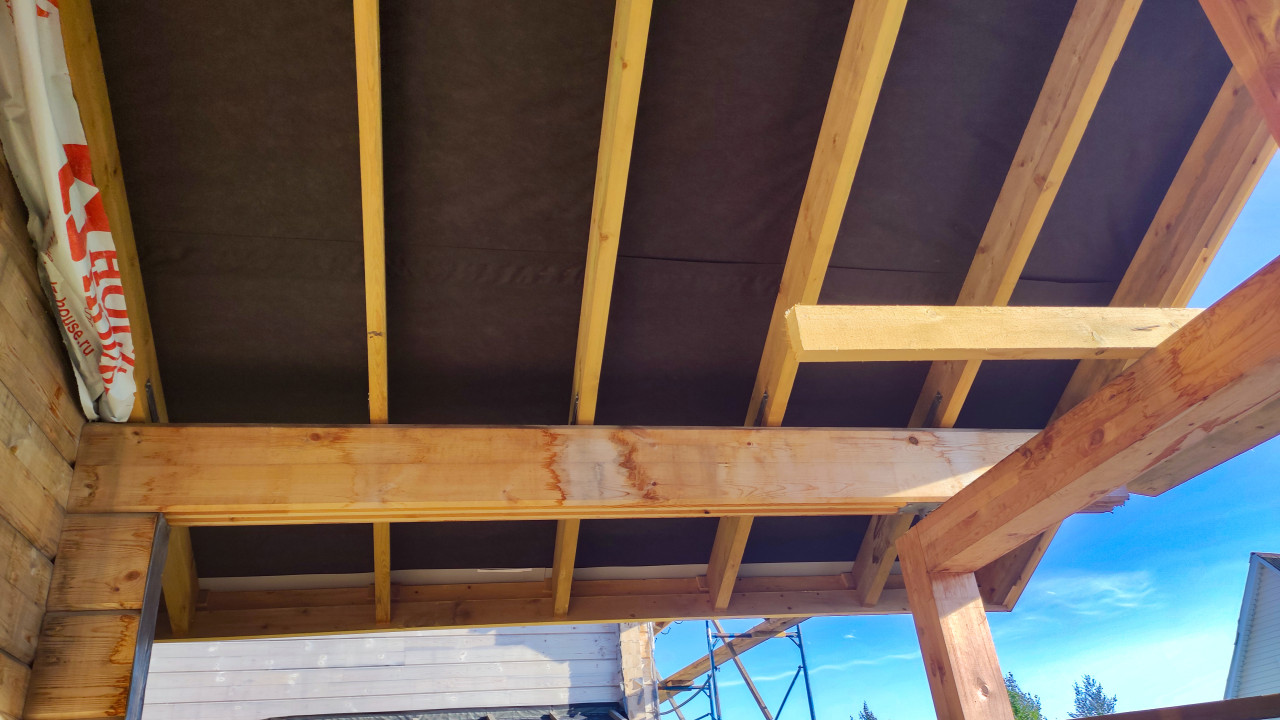 На фото показан фрагмент крыши деревянного дома на этапе строительства. Видны балки и стропила из светлого дерева, уложенные параллельно, а также черный гидроизоляционный слой, закрепленный под ними. В нижней части кадра проходит горизонтальная балка, поддерживающая конструкцию. В правой части заметны вертикальные стойки и опоры. Снимок можно использовать в материалах о строительстве частных домов, монтаже кровельных систем и архитектурных решениях.