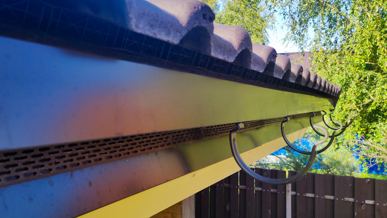 На изображении показан нижний край крыши, покрытой черепицей. Под карнизом закреплены металлические кронштейны для будущего монтажа водосточной системы. Видна вентиляционная решётка, обеспечивающая циркуляцию воздуха под кровлей. На заднем плане находятся зелёные деревья и деревянный забор. Снимок может быть использован в материалах о монтаже кровельных систем, вентиляции и установке водостоков.
