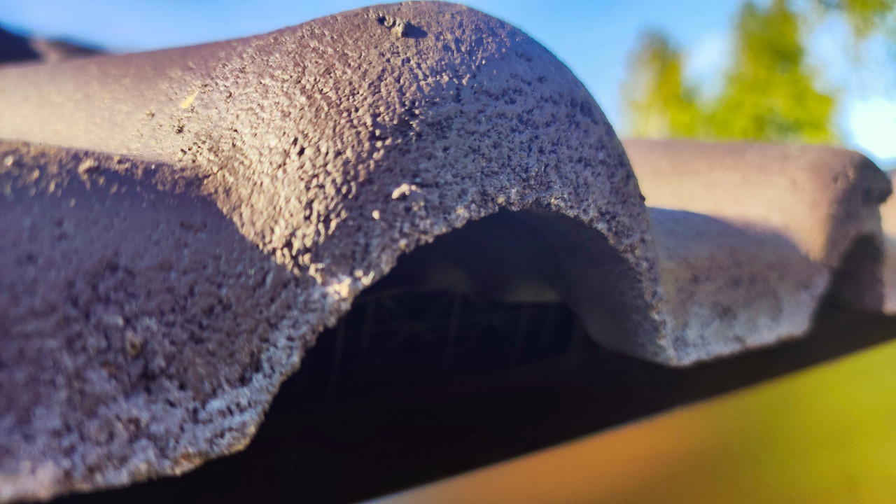 На фото представлен крупный план черепицы, уложенной на крыше жилого дома. Камера зафиксировала текстуру материала и форму элемента покрытия. На заднем плане, в расфокусе, заметна зелень деревьев. Снимок может использоваться в материалах о строительных материалах, выборе кровельных покрытий и технологии монтажа черепичных крыш.