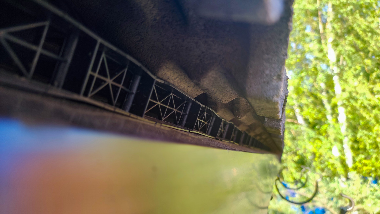 Фотография фиксирует нижнюю часть крыши с элементами вентиляции — пластиковыми решетками под волнистым краем кровельного покрытия. Конструкция предотвращает попадание птиц и крупных насекомых в подкровельное пространство, сохраняя циркуляцию воздуха. Съемка сделана снизу, виден край черепичной кровли и зеленая листва деревьев на заднем плане. Подобные элементы используются в современном строительстве для защиты и долговечности кровельных систем. Фото применимо в образовательных и справочных материалах о монтаже кровли и архитектурных деталях загородных домов.