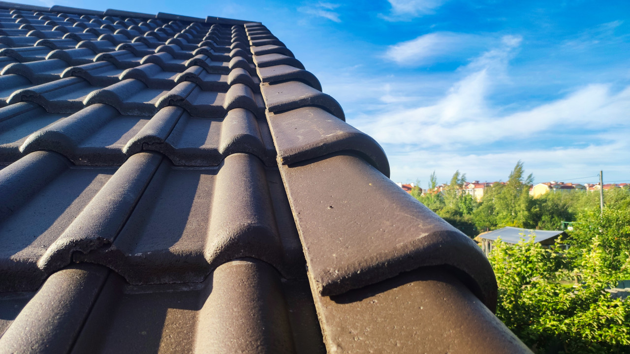 На фотографии показана верхняя часть крыши дома, покрытая черепицей темного оттенка. Съемка сделана вдоль конька, что позволяет рассмотреть ряды черепицы и их укладку. На фоне виден голубой небосвод с облаками, а также деревья и жилые дома вдалеке. Данный снимок демонстрирует пример устройства кровли с применением черепичных материалов, которые традиционно используются для обеспечения надежности и долговечности. Изображение может быть использовано в статьях о строительстве, ремонте и архитектурных решениях загородных домов.