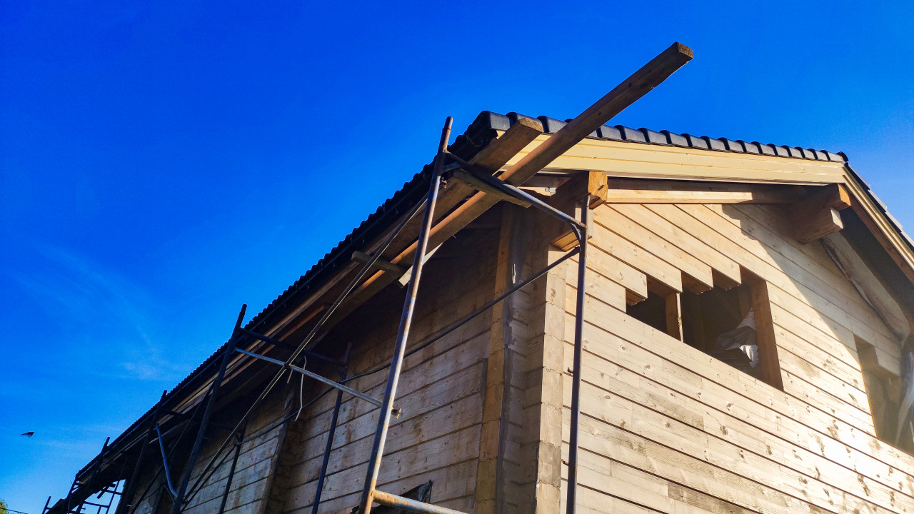 На фотографии изображен фасад деревянного дома в процессе строительства. Видны строительные леса, установленные вдоль стены, и крыша с уложенной темной черепицей. Фасад выполнен из деревянных панелей, на фронтоне оставлены оконные проемы. Снимок фиксирует этап монтажа кровельных и фасадных элементов. Фото может использоваться в материалах о строительных технологиях и возведении частных домов.