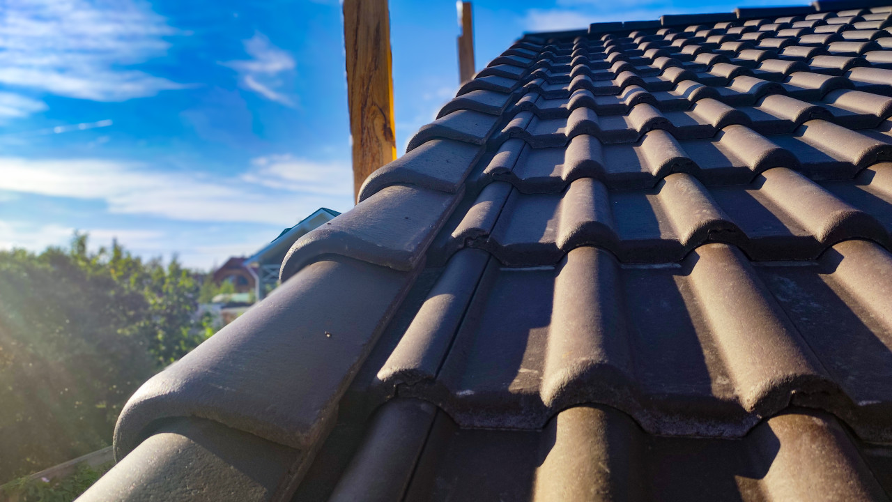 На фотографии изображена крыша частного дома, покрытая рядами керамической черепицы коричневого цвета. Вдоль конька уложены элементы кровли, обеспечивающие герметичность стыков. На фоне видны деревья, элементы соседних построек и голубое небо. Съемка под углом подчеркивает рельеф и форму черепицы. Фото может быть использовано в материалах о кровельных технологиях и архитектуре жилых домов.