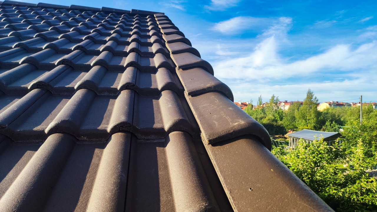 На фотографии изображена кровля частного дома с покрытием из керамической черепицы темного цвета. Съемка сделана вдоль конька крыши, хорошо видна геометрия укладки черепицы. На заднем плане заметны зеленые деревья, жилые дома и голубое небо с облаками. Данный снимок иллюстрирует устройство кровли, демонстрирует детали монтажа и может быть использован в материалах о строительстве, архитектуре и благоустройстве загородных домов.