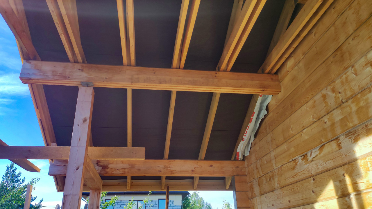 На изображении представлен общий вид кровельного свеса деревянного дома. Четко видна система стропил, уложенных параллельно, с закрепленной сверху обрешеткой и кровельным покрытием. Балки из светлого дерева соединены с вертикальными опорами, формируя конструкцию крыши. Часть стены дома облицована деревянными панелями. Фотография подходит для использования в статьях о строительстве, архитектуре и технологии устройства кровли.