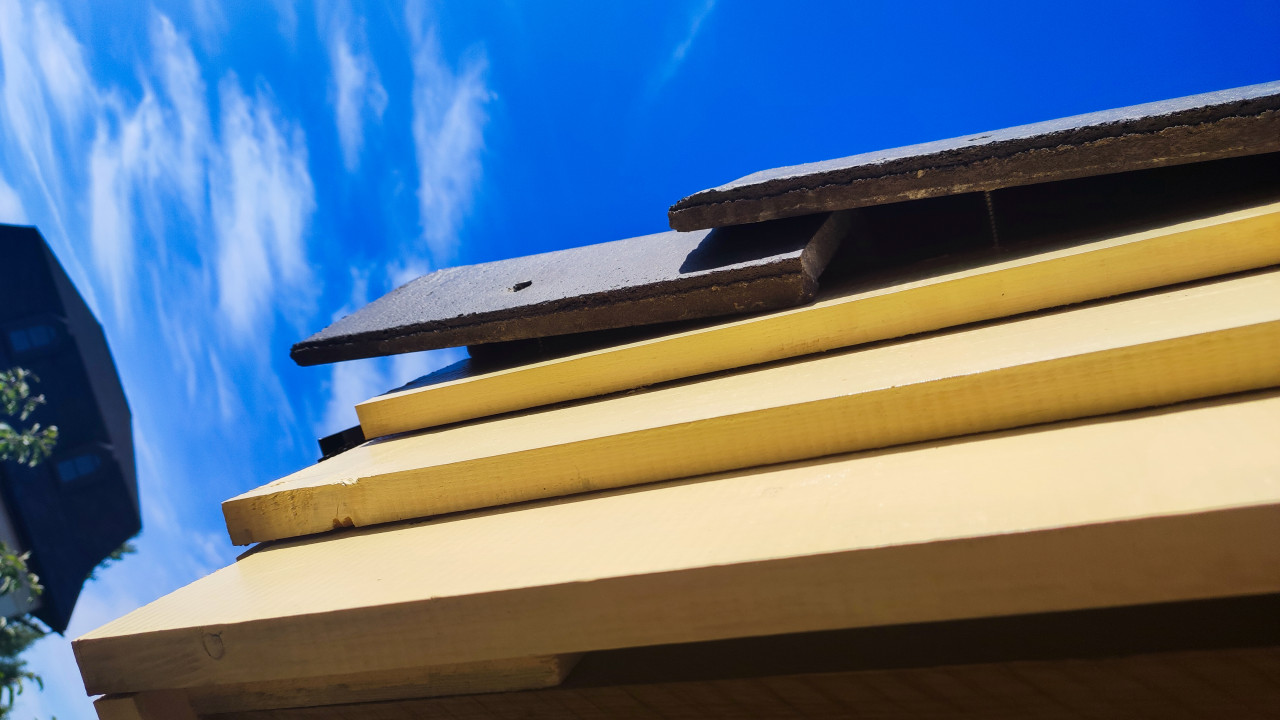 Нижний ракурс на черепицу и подшивку деревянной крыши