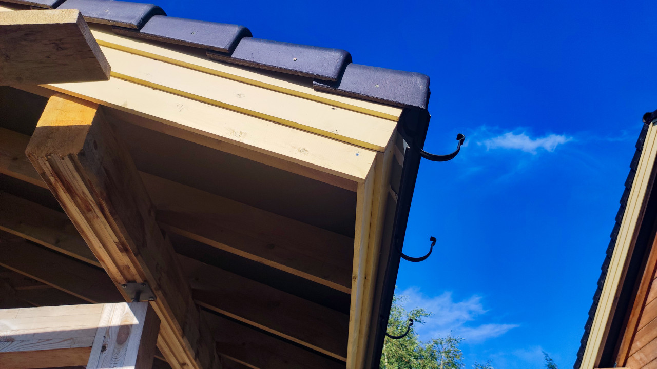 На фотографии показан фрагмент деревянной крыши в процессе строительства. Видна нижняя часть кровельного ската с уложенной черепицей и светлым деревянным подшивом, закрепленным на стропилах. По линии карниза установлены металлические кронштейны, предназначенные для монтажа водосточного жёлоба. Съемка выполнена в ясный день, что подчеркивает детали конструкции. Фото можно использовать для иллюстрации строительных технологий, монтажа кровли и элементов водосточной системы.