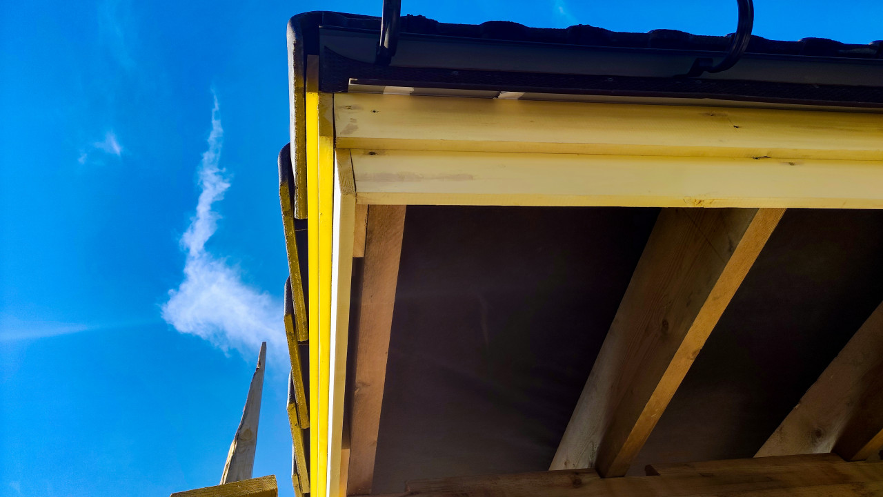 На фотографии показан фрагмент строящегося дома, снятый снизу. Видна кровля с черепицей темного цвета, деревянные балки перекрытия и окрашенные элементы карнизного свеса. Съемка подчеркивает конструктивные особенности крыши и демонстрирует этап строительства. На фоне — голубое небо с облаками. Фото может быть использовано в материалах о строительных технологиях, монтаже кровель и устройстве деревянных домов.