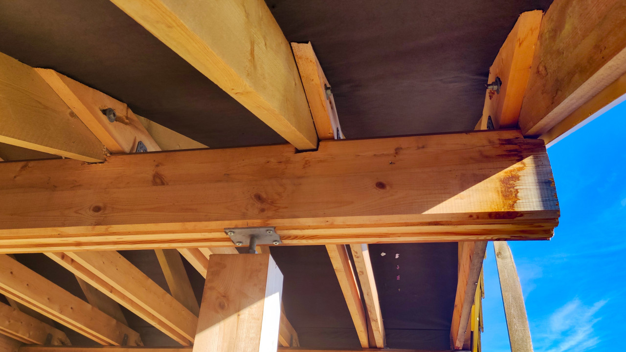 Фотография показывает внутреннюю часть стропильной системы деревянного дома. Видны балки из светлого дерева, закрепленные металлическими уголками и болтами, а также слой черного гидроизоляционного материала под крышей. Горизонтальная балка проходит вдоль кадра, обеспечивая жесткость конструкции. Снимок можно использовать для иллюстрации этапов строительства кровли и монтажа несущих элементов.