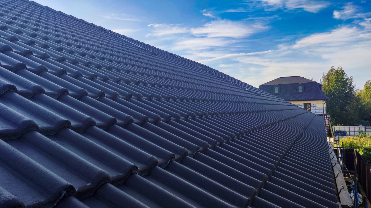 На изображении запечатлена скатная крыша жилого дома, покрытая металлочерепицей темного цвета. Съемка выполнена сбоку, что позволяет рассмотреть структуру рядов покрытия и ровность монтажа. Вдали просматриваются соседние дома и деревья, что указывает на частный жилой сектор. Фотография иллюстрирует использование современных кровельных материалов и аккуратный монтаж, она подходит для строительных и архитектурных публикаций.