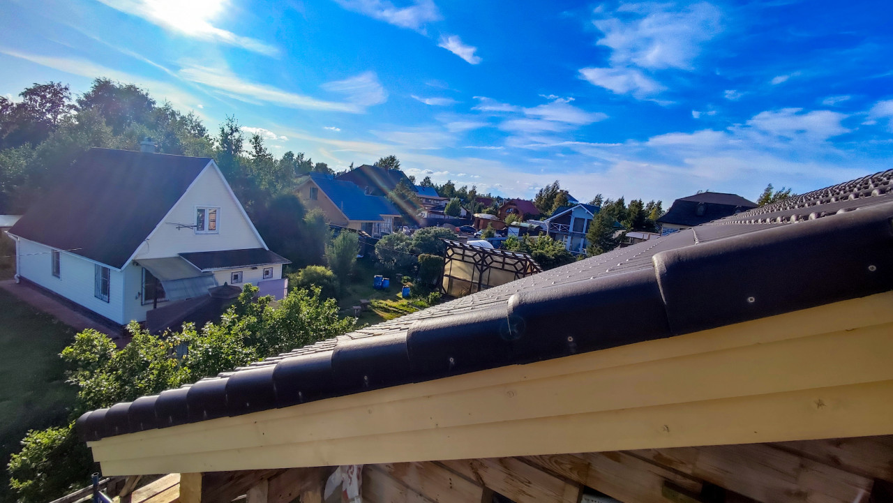 На фотографии запечатлен вид с крыши строящегося дома на прилегающий жилой район. В кадре видна часть ската крыши, покрытой темной металлочерепицей, а на заднем плане — несколько частных домов с различными типами кровельных материалов и приусадебные участки с зелеными насаждениями. Съемка выполнена с верхней точки, что позволяет подчеркнуть расположение домов в малоэтажной застройке. Фотография подходит для использования в иллюстрациях к темам загородного строительства, архитектуры и обустройства частных территорий.