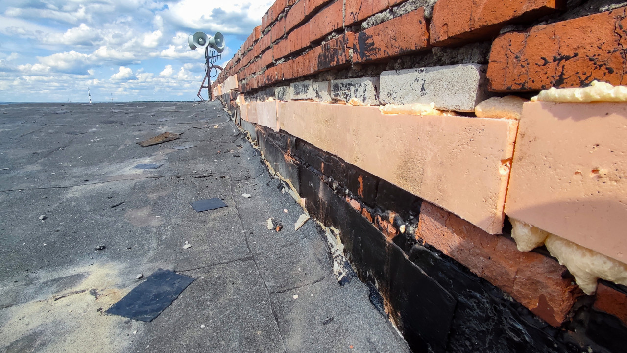На фото крупным планом показан парапет крыши кирпичного здания, в который установлены плиты утеплителя. Между слоями видна монтажная пена и следы битумной гидроизоляции. На заднем плане установлены громкоговорители на металлической стойке. Поверхность крыши имеет следы строительных работ и мусор. Снимок иллюстрирует этап ремонта и утепления кровли, процесс изоляции и защиты стен от влаги.