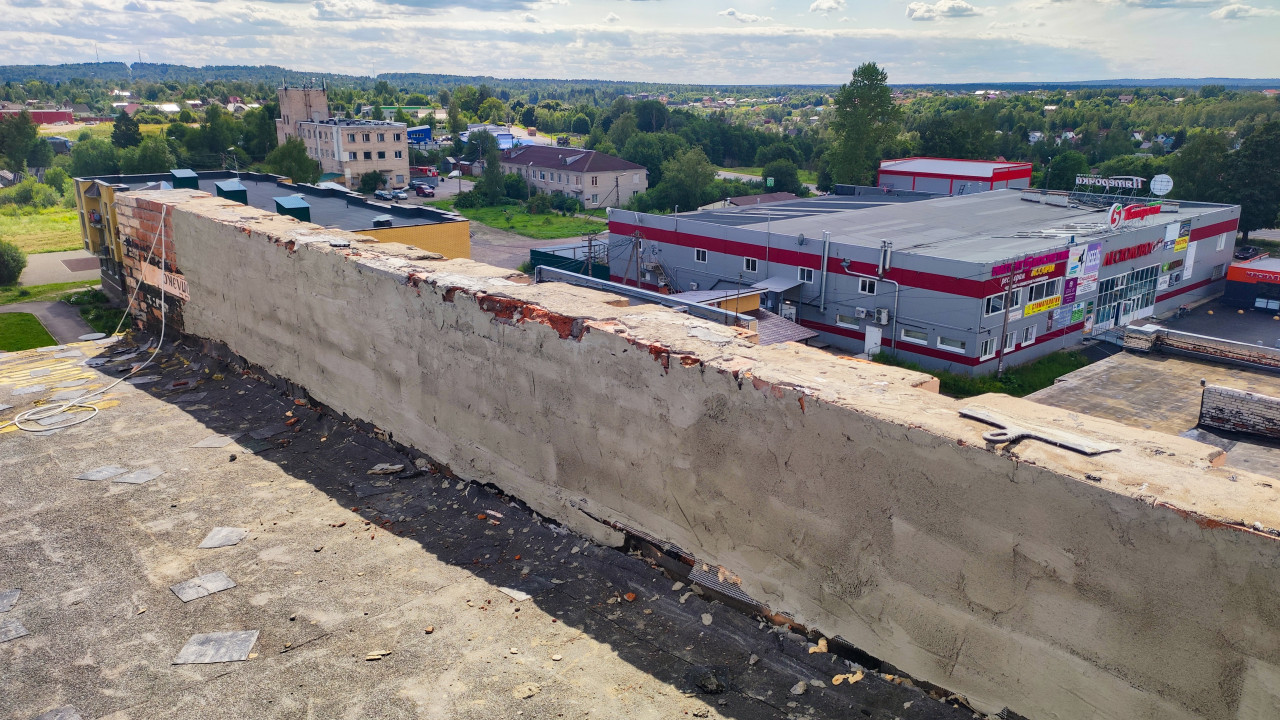 крыша ремонт крыши крыша здания износ кровельные работы ремонт кровли повреждения крыши кровля кровельное покрытие крыша дома торговый центр жилой район многоэтажка парапет бетон штукатурка разрушение ремонт промышленное здание городская среда архитектура Пятёрочка магазины красный фасад зелень лес горизонт пригород городское строительство эксплуатация зданий восстановление фасадов лето небоПохожие фотографии