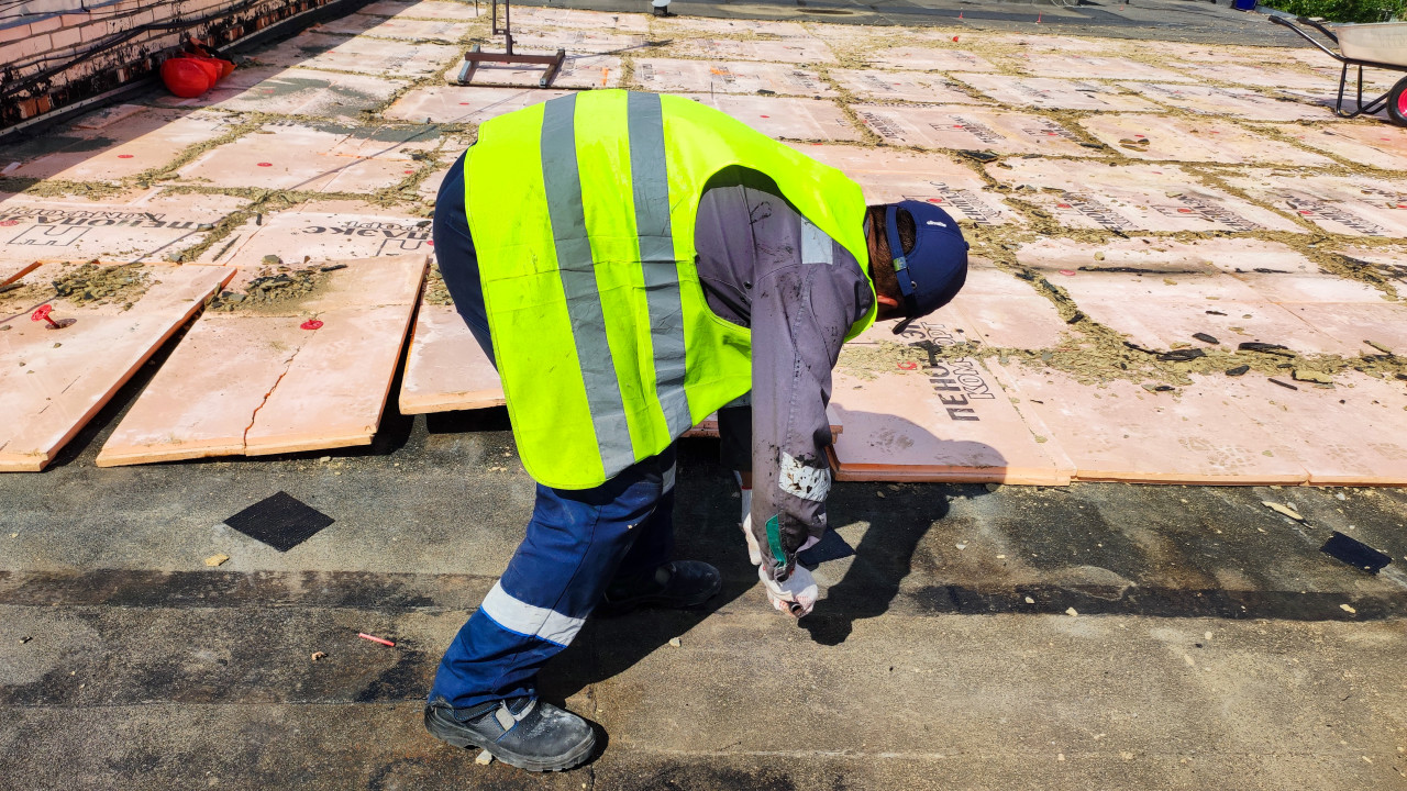 крыша ремонт крыши крыша здания износ кровельные работы ремонт кровли повреждения крыши кровля кровельное покрытие крыша дома утеплитель Пеноплэкс монтаж рабочий строительные работы плиты техника безопасности жилет плоская крыша стройка инструмент эксплуатация зданий кирпичная стена инженерные системы ЖКХ утепление строительные материалы монтажник работа строительный процесс лето строительный объект ремонтПохожие фотографии