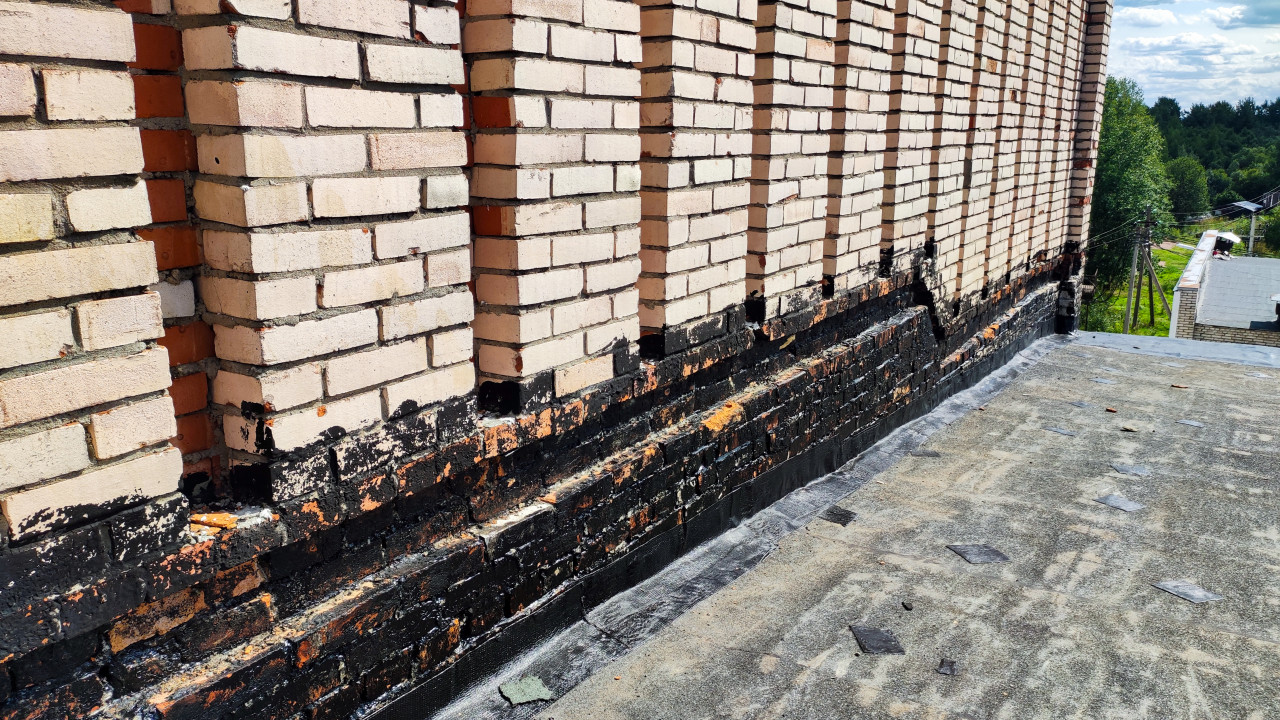 На фотографии изображена стена из светлого кирпича на крыше здания. Нижний ряд кладки имеет следы износа, остатки черного гидроизоляционного покрытия и сколы кирпича. На поверхности крыши виден рулонный материал с заплатами. На заднем плане заметны зелёные насаждения и жилые постройки. Снимок может быть использован для иллюстраций дефектов и ремонта кровельных примыканий.