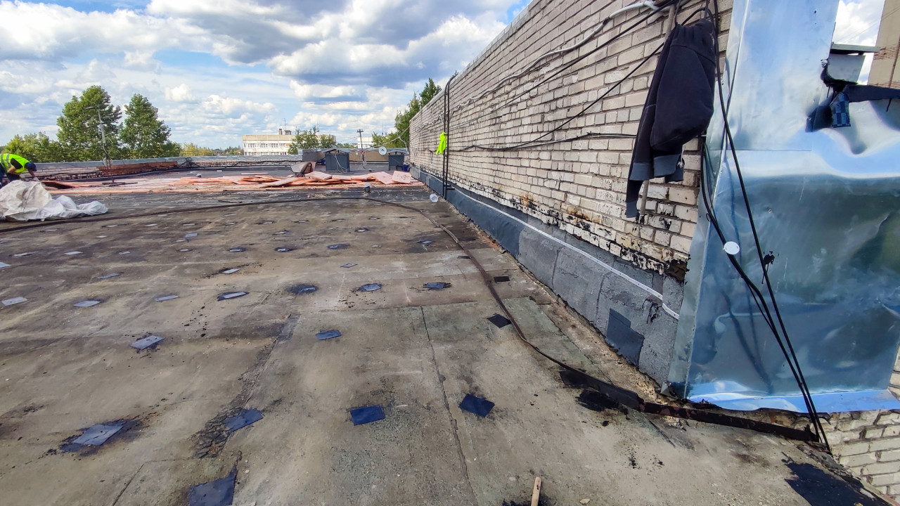 крыша ремонт крыши крыша здания износ кровельные работы ремонт кровли повреждения крыши кровля кровельное покрытие крыша дома плоская крыша кирпичная стена демонтаж строительные работы кабели металлическая обшивка инженерные системы рулонное покрытие ЖКХ эксплуатация зданий стройка восстановление утеплитель демонтаж утеплителя строительные материалы примыкание обследование городская архитектура строительный процесс лето монтаж инженерные сетиПохожие фотографии