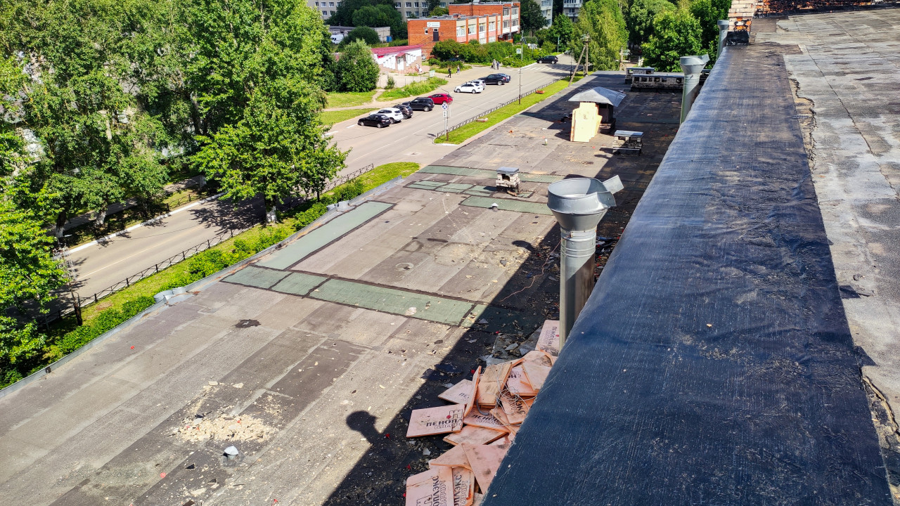 крыша ремонт крыши крыша здания износ кровельные работы ремонт кровли повреждения крыши кровля кровельное покрытие крыша дома вид сверху улица парковка автомобили утеплитель Пеноплэкс строительные материалы парапет рулонное покрытие демонтаж эксплуатация зданий ЖКХ городская архитектура стройка городская среда жилой район лето деревья обследование строительные дефекты восстановление инженерные системы жильёПохожие фотографии