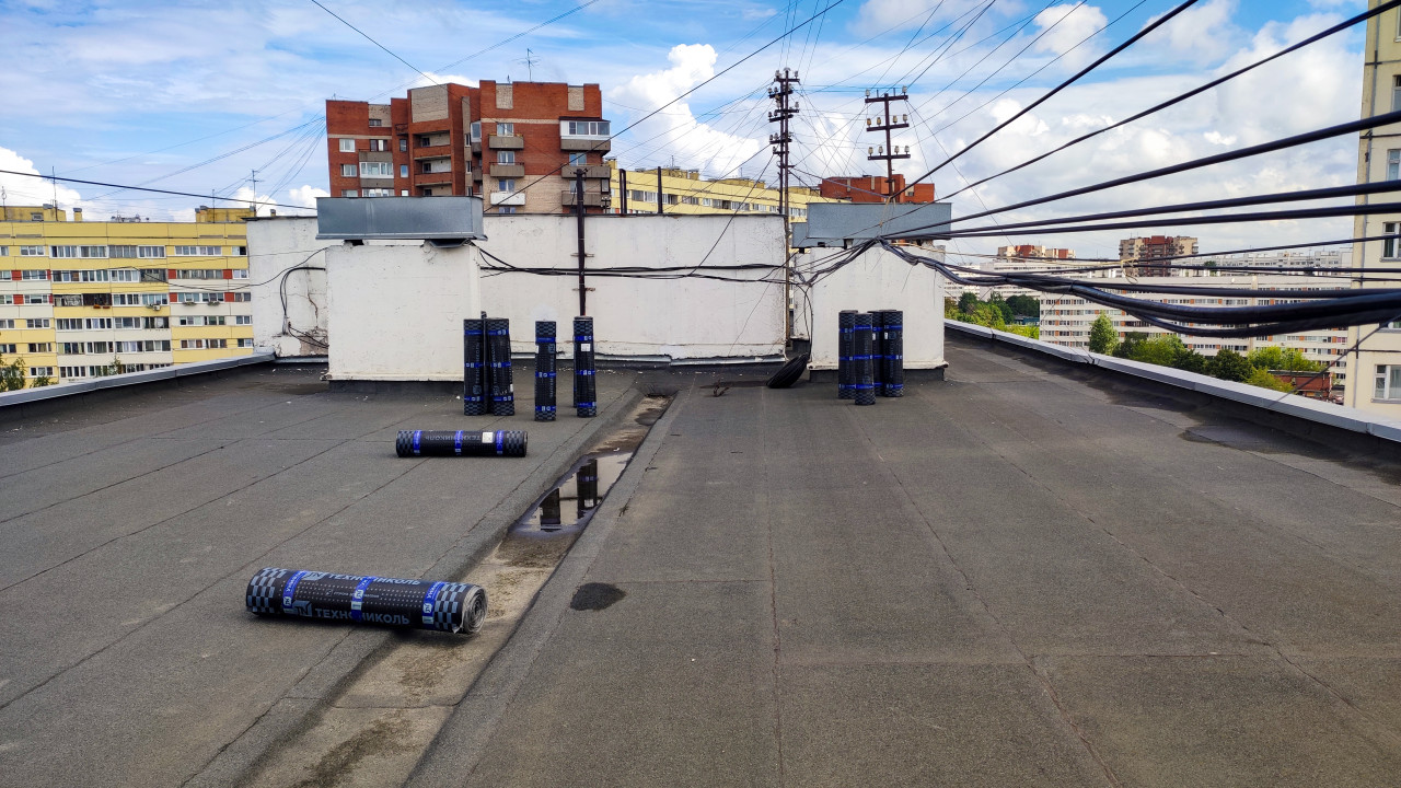 На фотографии изображена плоская крыша многоквартирного дома в жилом районе, где уложены рулоны гидроизоляционного материала марки «Технониколь», подготовленные для ремонта покрытия. Видны серые асфальтобитумные плиты, лужи после дождя, вентиляционные шахты и многочисленные кабели, протянутые через крышу. На заднем плане заметны многоэтажные дома типовой советской и постсоветской застройки. Снимок фиксирует этап подготовки кровельных работ и может быть использован в материалах о строительстве, ремонте и эксплуатации городских жилых зданий.