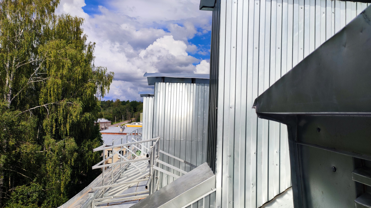 На фотографии показан участок крыши с металлическими облицовочными элементами из профилированного листа. На переднем плане видны части вентиляционных шахт и ограждающих конструкций. На заднем плане — деревья и низкая застройка, что указывает на окраинный или малоэтажный городской район. Снимок фиксирует строительные работы и особенности устройства металлических ограждений на крыше. Фото можно использовать для иллюстраций в тематиках строительства, архитектуры и инженерных решений.