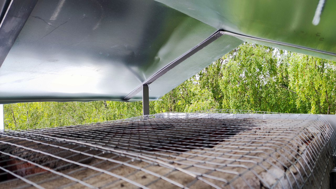 На изображении представлен крупный план вентиляционной шахты на крыше, накрытой металлическим козырьком для защиты от атмосферных осадков. Сетка, расположенная на верхней части конструкции, предотвращает попадание мусора и птиц. На заднем плане видны кроны деревьев, создающие естественный фон. Снимок отражает особенности инженерных решений при устройстве кровельных конструкций и может быть использован для публикаций на тему вентиляции и строительства.