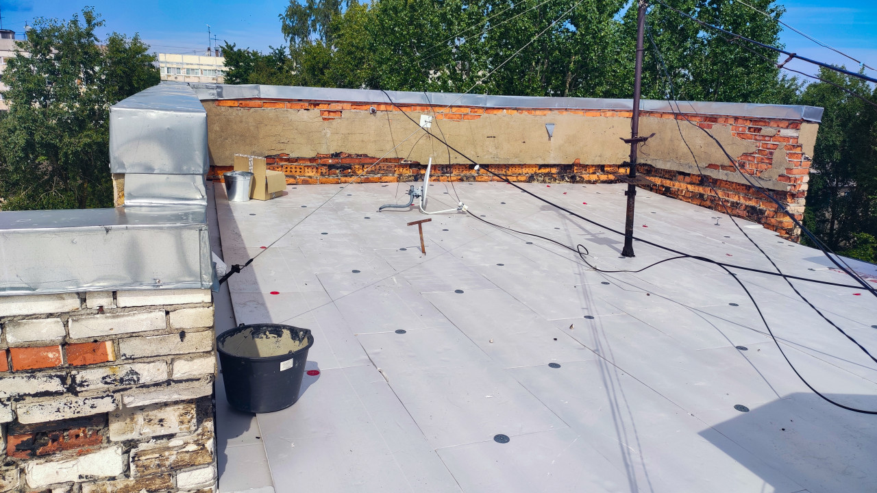 Фотография демонстрирует участок крыши здания, покрытой новым белым материалом с закреплёнными крепежными элементами. На поверхности заметны кабели и металлические конструкции, а по периметру идёт кирпичный парапет с частично разрушенной штукатуркой и остатками битумного покрытия. На переднем плане стоит пластиковое строительное ведро, что указывает на ongoing ремонт. Снимок отражает тему инженерных элементов зданий, может быть использован в публикациях о строительстве и техническом обслуживании.