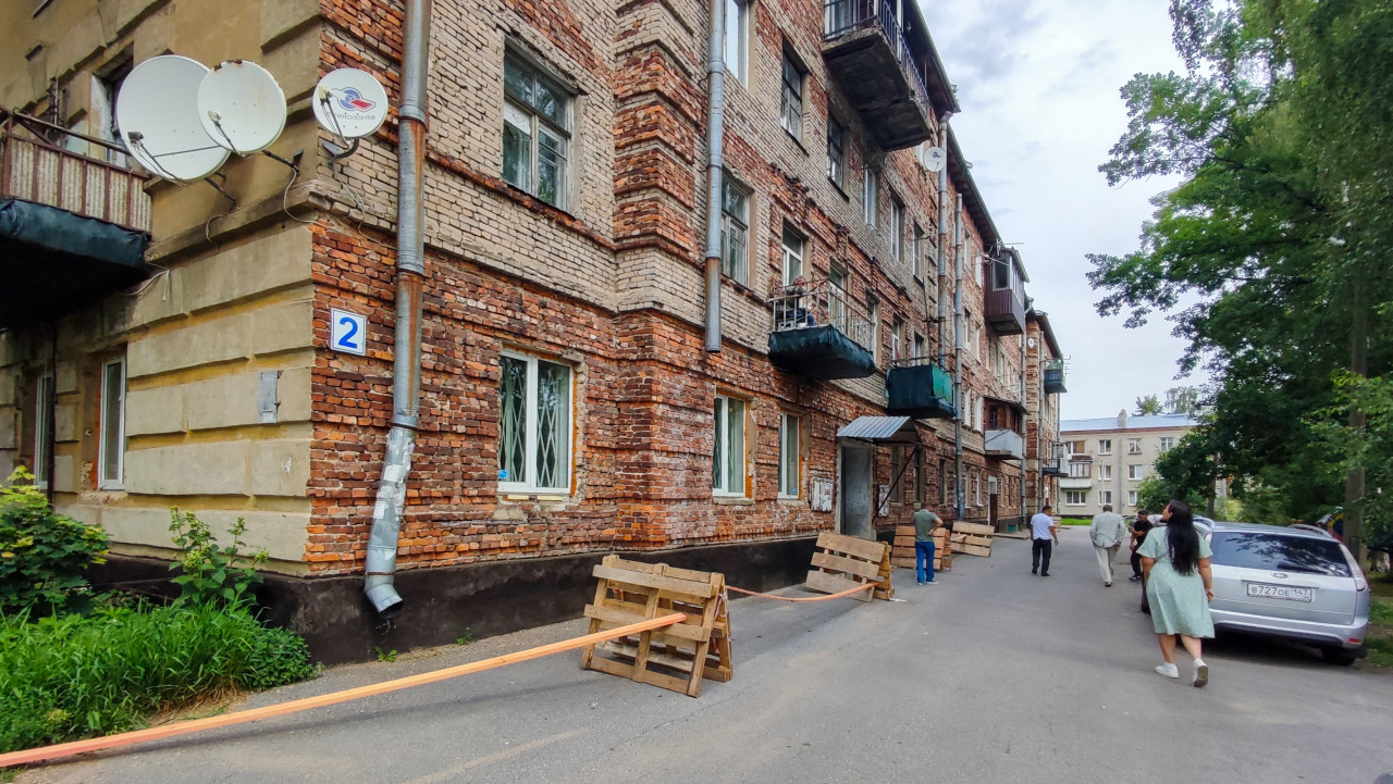 На фотографии показан фасад кирпичного жилого дома, построенного в середине XX века, с характерной кладкой и выступающими рядами кирпичей. На стенах заметны спутниковые антенны, водосточные трубы и металлические решетки на окнах. Вдоль здания установлены временные деревянные ограждения, предупреждающие о ремонтных работах. Несколько жильцов и прохожих находятся рядом, часть людей осматривает дом. Данный тип архитектуры характерен для массовой жилой застройки советского периода. Снимок может быть использован в публикациях о городской инфраструктуре, ремонте зданий и состоянии жилфонда.