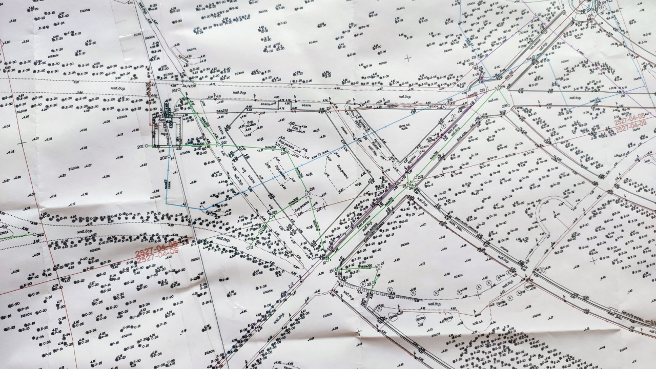 На фото представлен подробный фрагмент генерального плана территории с нанесёнными инженерными сетями, дорогами и зелёными массивами. На схеме показаны дорожные развязки, коммуникации, границы участков, а также условные обозначения для рельефа. Чертёж используется в проектировании общественных пространств, включая парки и скверы. Фото подходит для иллюстрации статей о кадастровых планах, градостроительстве и ландшафтной архитектуре.
