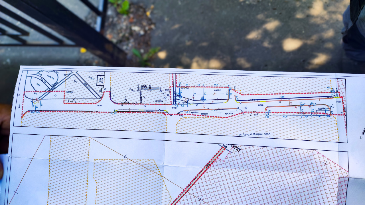 На фото изображен строительный план, демонстрирующий проект благоустройства территории. На чертеже отмечены зоны дорожного покрытия, зеленые насаждения, инженерные коммуникации и разметка бордюров. Документ держат в руках, в кадре видна часть одежды человека. Чертеж предназначен для выполнения дорожных и дворовых работ и иллюстрирует проектную документацию, используемую при реконструкции придомовой территории. Снимок может применяться в публикациях о строительстве, проектировании и планировке городской среды.