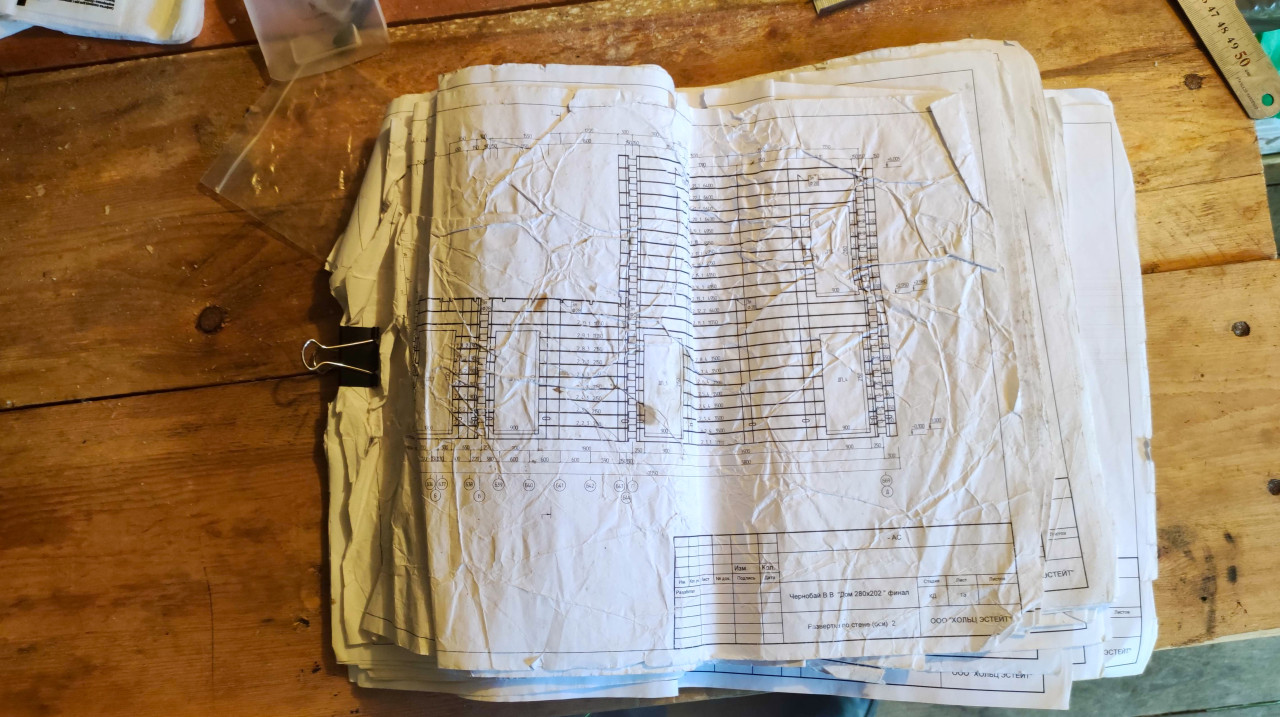 Снимок показывает чертеж деревянного дома с детализацией стен и обозначением размеров. Бумага заметно смята и закреплена зажимом. На листе присутствуют разметки элементов конструкции, нумерация и пояснительные данные, таблица с проектной информацией. Фон фотографии — деревянный стол, на котором разложена документация. Изображение фиксирует рабочую строительную документацию и может применяться в материалах о проектировании зданий, подготовке инженерных планов и организации строительных процессов.