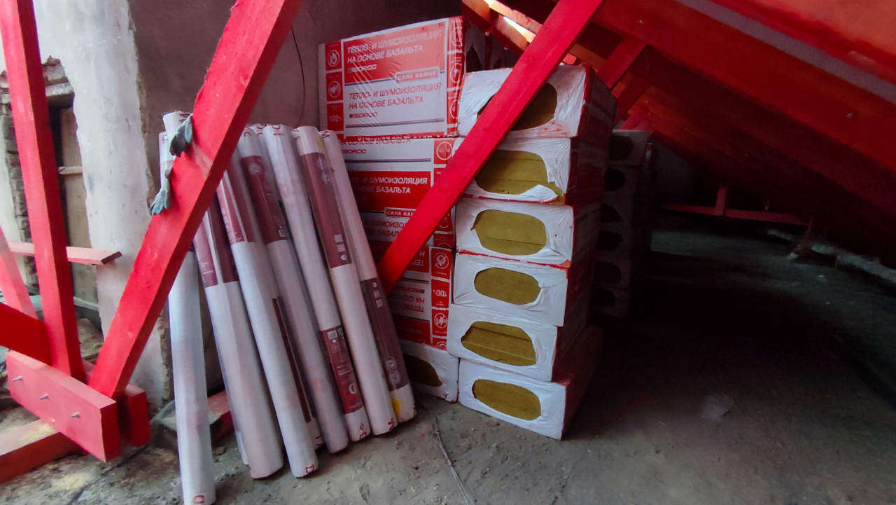 На фотографии изображены строительные материалы, аккуратно сложенные в чердачном помещении. На полу и вдоль стен расположены упаковки утеплителя на основе базальта и рулоны изоляционных материалов. Конструкции крыши выполнены из деревянных балок, окрашенных защитным составом. Сцена иллюстрирует подготовительный этап утепления и ремонта крыши жилого дома. Фотография подходит для использования в материалах о строительстве, теплоизоляции и инженерных решениях.