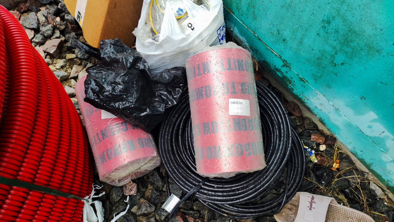 На фотографии изображены строительные материалы: две катушки в красной пленке с надписью, бухта черного кабеля и рядом размещенные пакеты и коробки. Все предметы лежат на щебеночном основании у стены металлического контейнера. Видны следы влаги и капли дождя на поверхности упаковки, что подтверждает уличные условия съемки. Культурных или архитектурных объектов в кадре нет. Фото можно использовать в каталогах строительных и электромонтажных материалов, в инструкциях и документации по монтажу инженерных сетей.