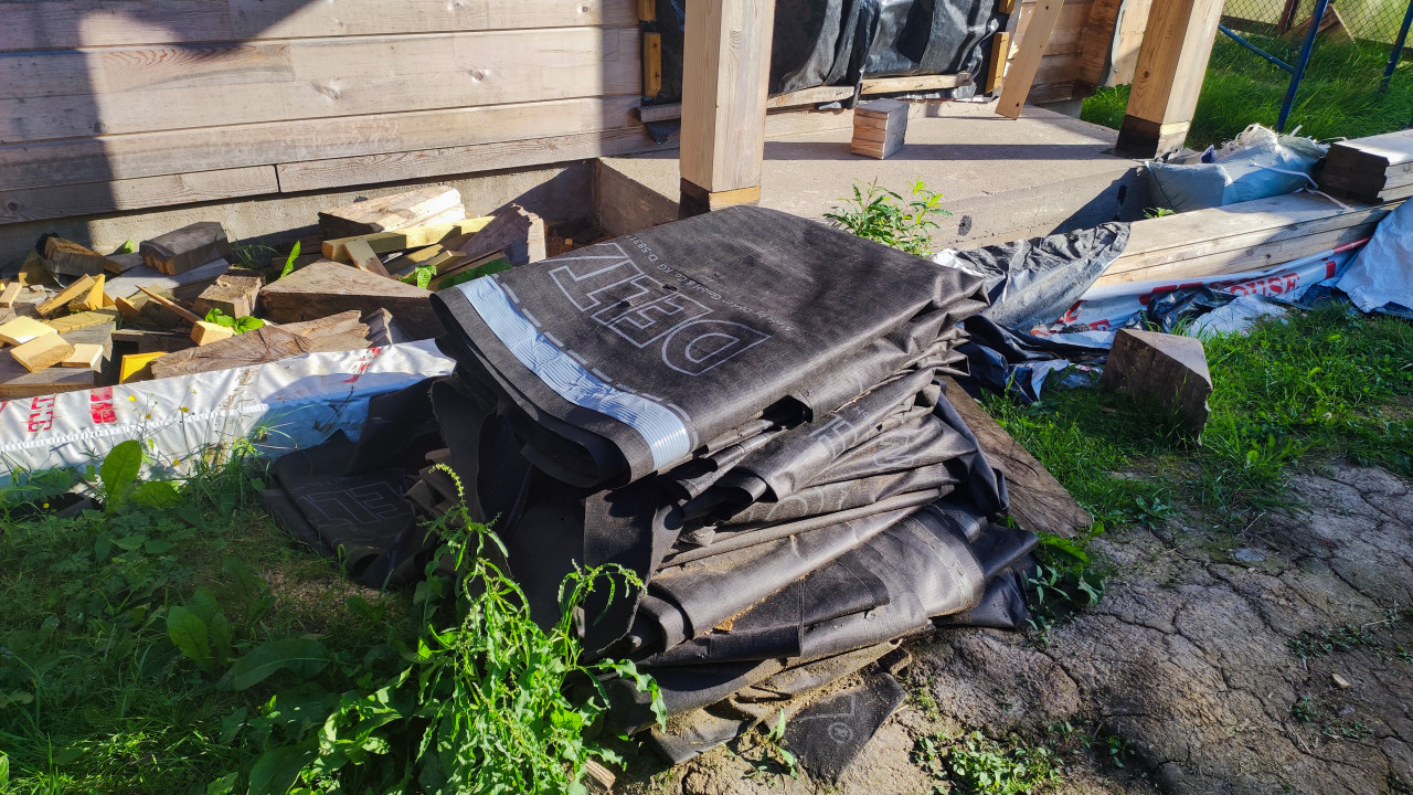 Складирование рулонов гидроизоляционного материала возле дома