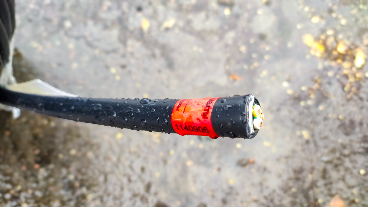 На снимке изображен конец черного кабеля с обрезанной изоляцией, на котором закреплена красная маркировочная бирка с числовым кодом. На срезе кабеля видны внутренние жилы с цветной изоляцией. Кабель лежит на мокрой поверхности, капли воды заметны на его оболочке, что указывает на съемку на улице в сырую погоду. Изображение фиксирует технические детали конструкции кабеля и может быть полезно для иллюстраций в каталогах электротехнической продукции, инструкциях по монтажу, а также в материалах о строительстве и инженерных сетях.
