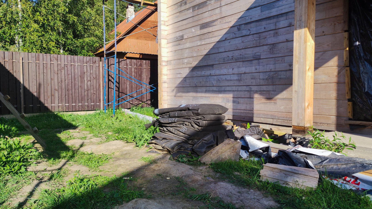 Фотография фиксирует строительную площадку возле стены деревянного дома. На переднем плане лежат сложенные рулоны гидроизоляционного материала, рядом — обрезки древесины и строительные отходы. Видны стойки конструкции и участок газона. На заднем плане — забор и часть соседнего здания. Снимок может использоваться для иллюстрации организации стройплощадки и этапов строительства.