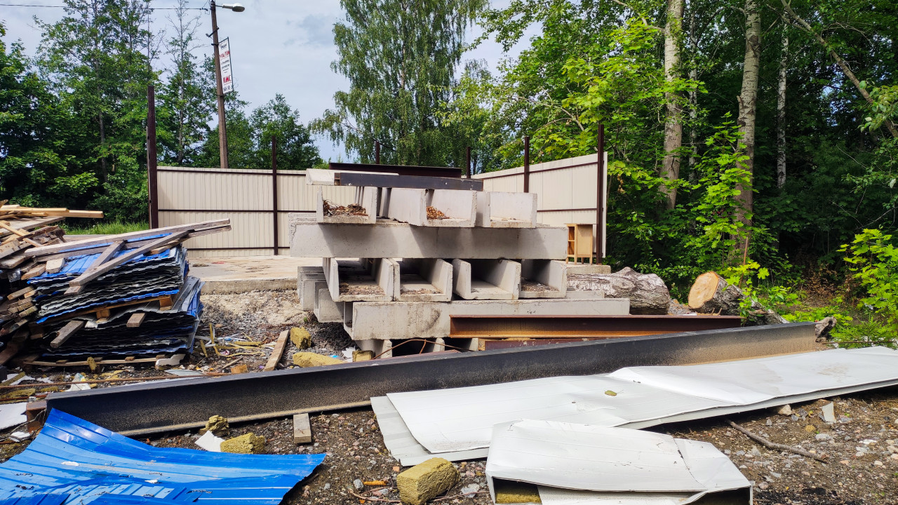 На фото изображён склад строительных материалов на открытой площадке. В центре кадра сложены массивные бетонные блоки с полостями, рядом видны листы синего и белого профнастила, металлические балки и обрезки строительных материалов. На заднем плане установлен светлый металлический забор, за которым видны зелёные деревья и электрический столб с проводами. Культурной или исторической ценности объект не имеет. Снимок можно использовать для иллюстраций складирования стройматериалов и демонстрации логистики строительного процесса.