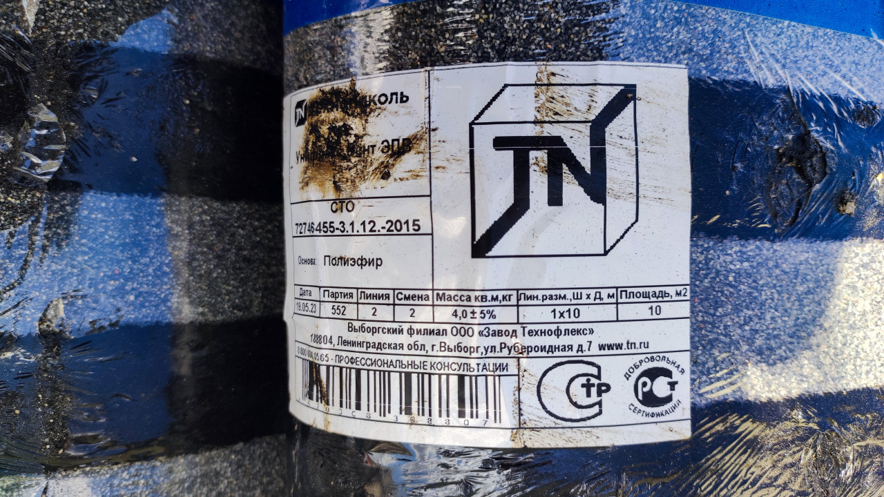 На фотографии крупным планом показана этикетка рулонного кровельного материала марки «Технониколь». Видны технические характеристики: масса 4 кг/м², размеры рулона 1×10 м, площадь 10 м². Указаны данные о производителе — завод «Технофлекс» во Всеволожске Ленинградской области. Этикетка частично загрязнена следами стройматериалов. Снимок может использоваться для иллюстрации строительных товаров, спецификаций материалов и этапов подготовки к кровельным работам.