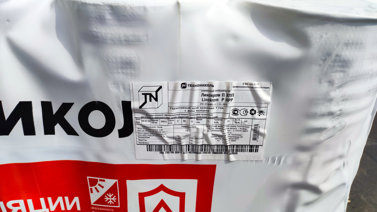Крупный план упаковки строительного материала «Линокром П ХПП» производства компании «Технониколь». На этикетке указаны характеристики: дата выпуска, партия, масса, площадь рулона и завод-изготовитель (Выборгский филиал). Материал предназначен для устройства кровель и гидроизоляции строительных конструкций.