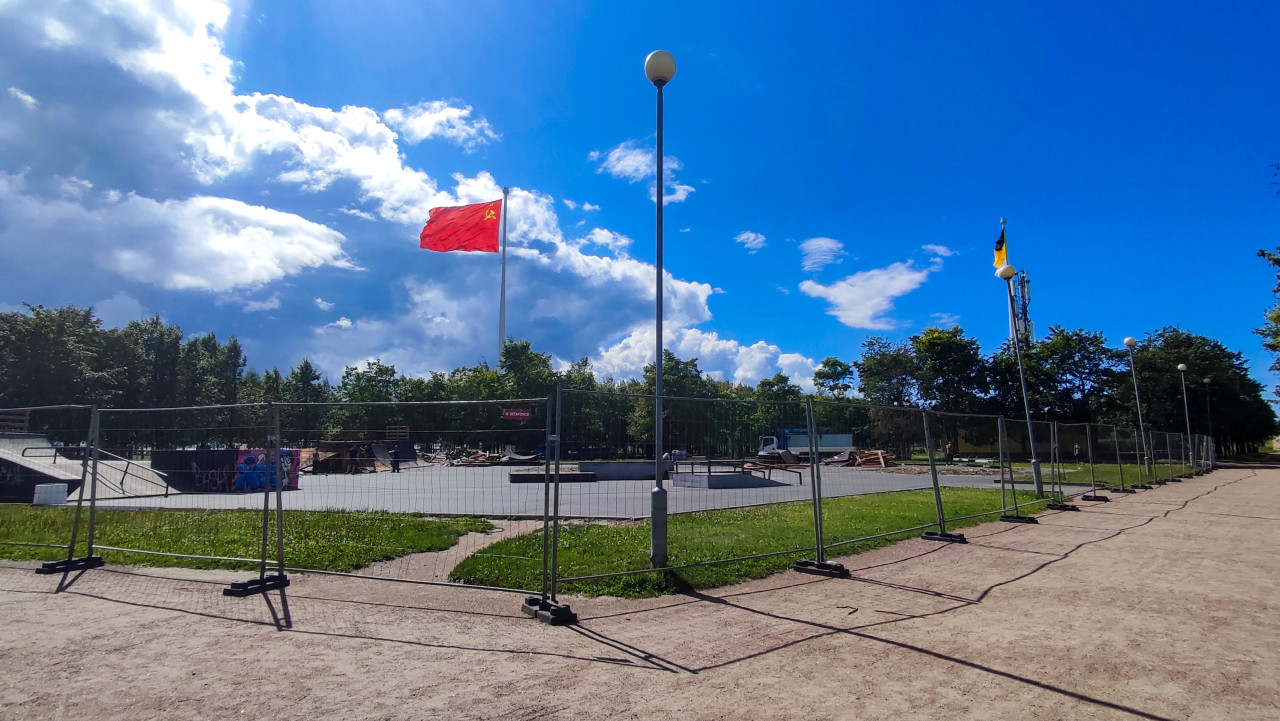 На фотографии изображена территория, ограждённая металлическим забором, где установлены два высоких флагштока с советским флагом и чёрно-жёлто-белым флагом. Внутри ограждения видны элементы спортивной площадки с граффити, а также конструкции для катания. Съёмка выполнена днём при яркой солнечной погоде. Кадр отражает сочетание символики и городской среды, что делает его актуальным для публикаций о парках, спорте и общественных пространствах.