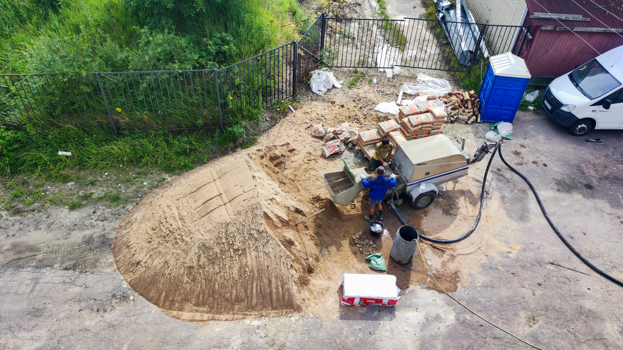 Снимок сделан сверху и показывает участок, где ведутся работы по приготовлению строительного раствора. На переднем плане видна большая куча песка, рядом стоит установка с рабочими, мешки с цементом и строительные материалы. На площадке также расположены деревянные бруски, пластиковая тара и переносная туалетная кабина. Сцена демонстрирует организацию строительного процесса на временной площадке.