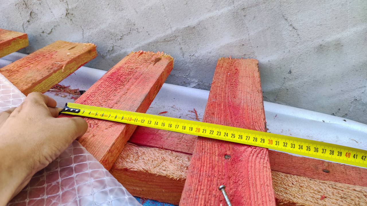 На фото зафиксирован процесс замера расстояния между досками деревянной обрешётки крыши при помощи строительной рулетки. Доски имеют красноватый оттенок из-за антисептической обработки, а под ними виден белый слой гидроизоляционной плёнки. На переднем плане заметна рука рабочего, удерживающая рулетку, фиксирующую расстояние примерно 30 см. Слева в кадре частично видна защитная сетка. Фотография сделана в дневное время в ходе строительных работ по реконструкции кровли многоквартирного дома. Исторических или культурных объектов в кадре нет.