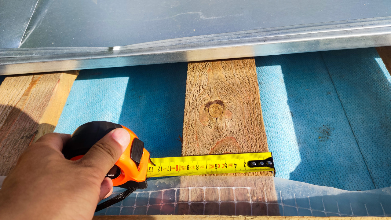 На фото показан строительный процесс, где рабочий использует рулетку для измерения ширины деревянной обрешётки под металлическим кровельным элементом. В кадре видно синее гидроизоляционное покрытие, металлический лист и деревянную доску с ярко выраженными кольцами спила. Измерения фиксируются на отметке около 12 см. Объектом съёмки является технический этап контроля размеров при строительстве крыши. Культурно-исторических объектов на фото нет. Снимок можно использовать в строительных инструкциях, презентациях и обучающих материалах.