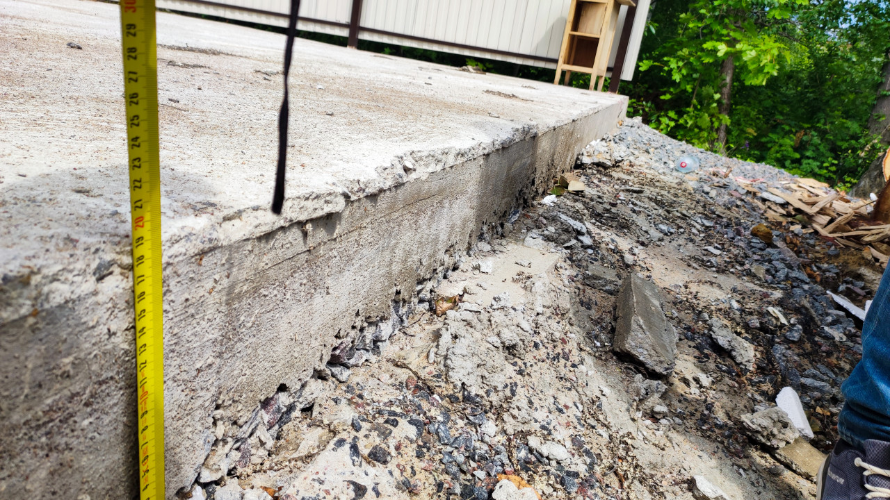 На фотографии показан фрагмент строительной площадки с бетонным основанием. На переднем плане видна рулетка, фиксирующая высоту бетонного края около 20 см. Основание выполнено из монолитного бетона, но его нижняя часть имеет сколы и неровности. Вокруг расположены щебень, строительный мусор и остатки старых материалов. В верхней части кадра можно заметить часть ограждения и деревянный предмет мебели. Фото иллюстрирует процесс контроля размеров и состояния фундамента. Культурных или исторических объектов в кадре нет.