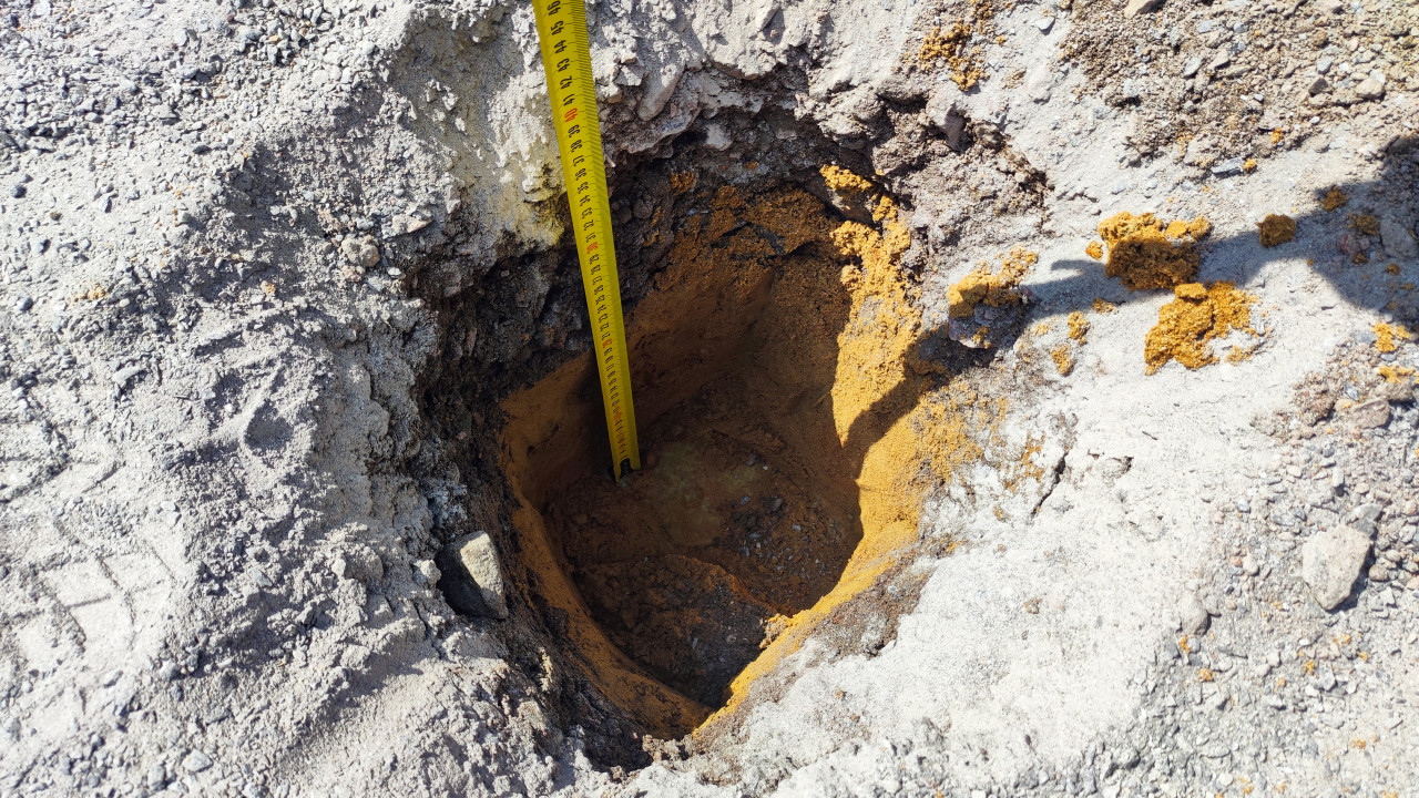 На снимке показан процесс проверки глубины выемки в грунте. В центре изображения находится яма с песчаным основанием и слоями щебня, по краям которой вставлена рулетка для измерения. На стенках ямы хорошо различимы разные слои засыпки: верхний серый слой щебня и нижний желтый песчаный. Фото иллюстрирует контроль качества подготовки основания под дорожки или площадки и может быть использовано в материалах о строительстве и благоустройстве.