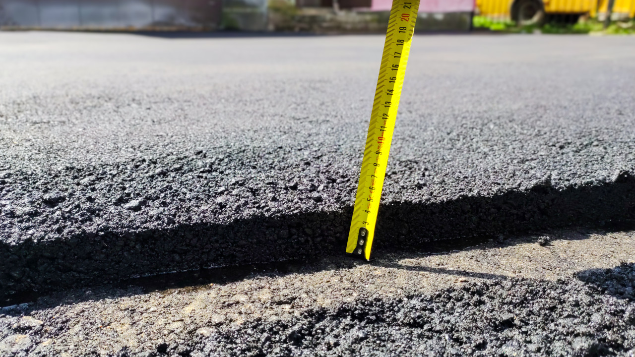 На фотографии крупным планом показан процесс контроля толщины асфальтового покрытия. В кадре видна поверхность свежего асфальта, в который вставлена строительная рулетка, показывающая высоту слоя около 6 сантиметров. Снимок сделан при дневном свете, на фоне различимы очертания здания и техники, характерные для ремонтных работ. Изображение демонстрирует этап проверки качества дорожного покрытия, без привязки к историческим объектам. Фотография может быть использована в статьях о строительстве дорог, стандартах укладки асфальта, контроле качества и ремонте дорожного покрытия.