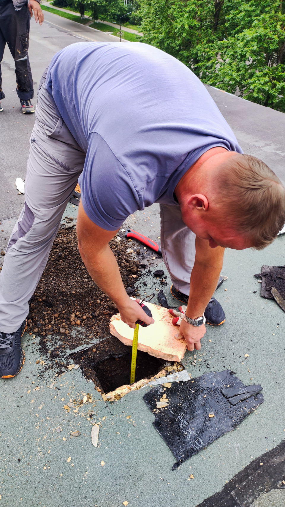 На фото изображен рабочий, выполняющий измерение рулеткой глубины конструктивного основания на крыше многоквартирного жилого дома. Вокруг видны утеплитель и элементы разрушенного слоя покрытия, а также строительные инструменты. Снимок отражает процесс строительной экспертизы и контроля качества работ при капитальном ремонте крыши. Может использоваться в публикациях о техническом обследовании, реконструкции и строительном надзоре.