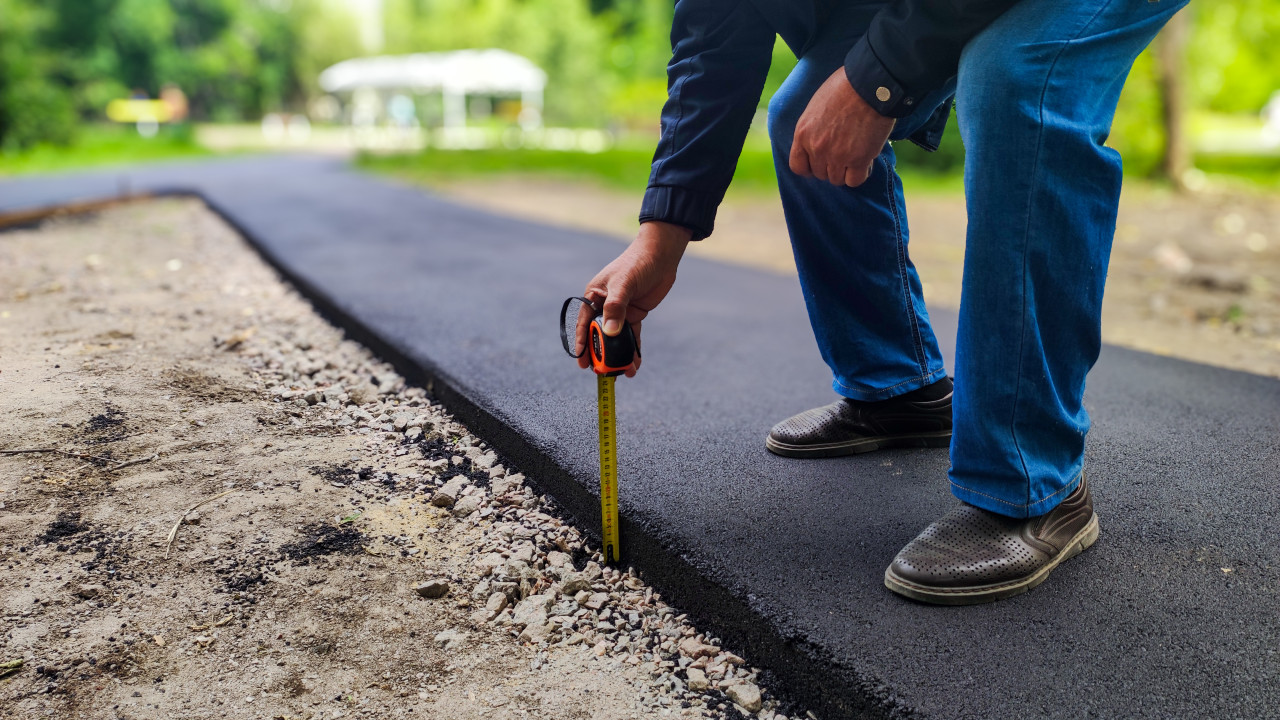 На фотографии изображён человек, проводящий замеры толщины асфальта на пешеходной дорожке во дворе жилого района. Он держит строительную рулетку и фиксирует показатели слоя, который уложен на подготовленное щебёночное основание. В кадре видны ноги человека в джинсах и обуви, часть дорожки и прилегающий грунт. Снимок иллюстрирует процесс контроля выполненных работ по благоустройству территории. На заднем плане размытая зелень и элементы дворовой инфраструктуры.