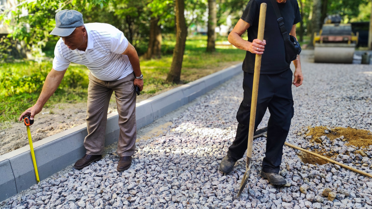 На фото показан момент контроля качества дорожных работ. Один мужчина измеряет рулеткой высоту нового бетонного бордюра относительно уровня щебня, другой держит инструмент для выравнивания основания. На заднем плане виден участок дороги с уплотненным щебнем, дорожный каток и зеленые насаждения. Сцена демонстрирует этап проверки параметров при благоустройстве дворовых территорий. Фотографию можно использовать в материалах о строительном надзоре, дорожном ремонте и контроле качества работ.