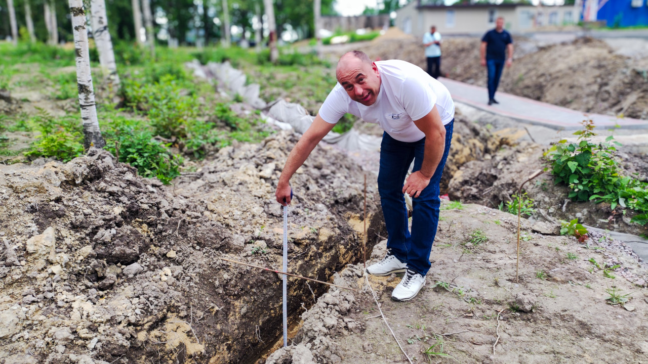 На фото изображён мужчина в белой футболке и джинсах, который при помощи рулетки измеряет глубину траншеи. На заднем плане видны земляные насыпи, зелёные насаждения и другие люди. Траншея проходит через строительный участок и предназначена для прокладки кабельных коммуникаций. На дне уложена защитная лента. Снимок отражает этап контроля качества строительных работ. Фотография подходит для тематики инженерных систем, строительного контроля и благоустройства.